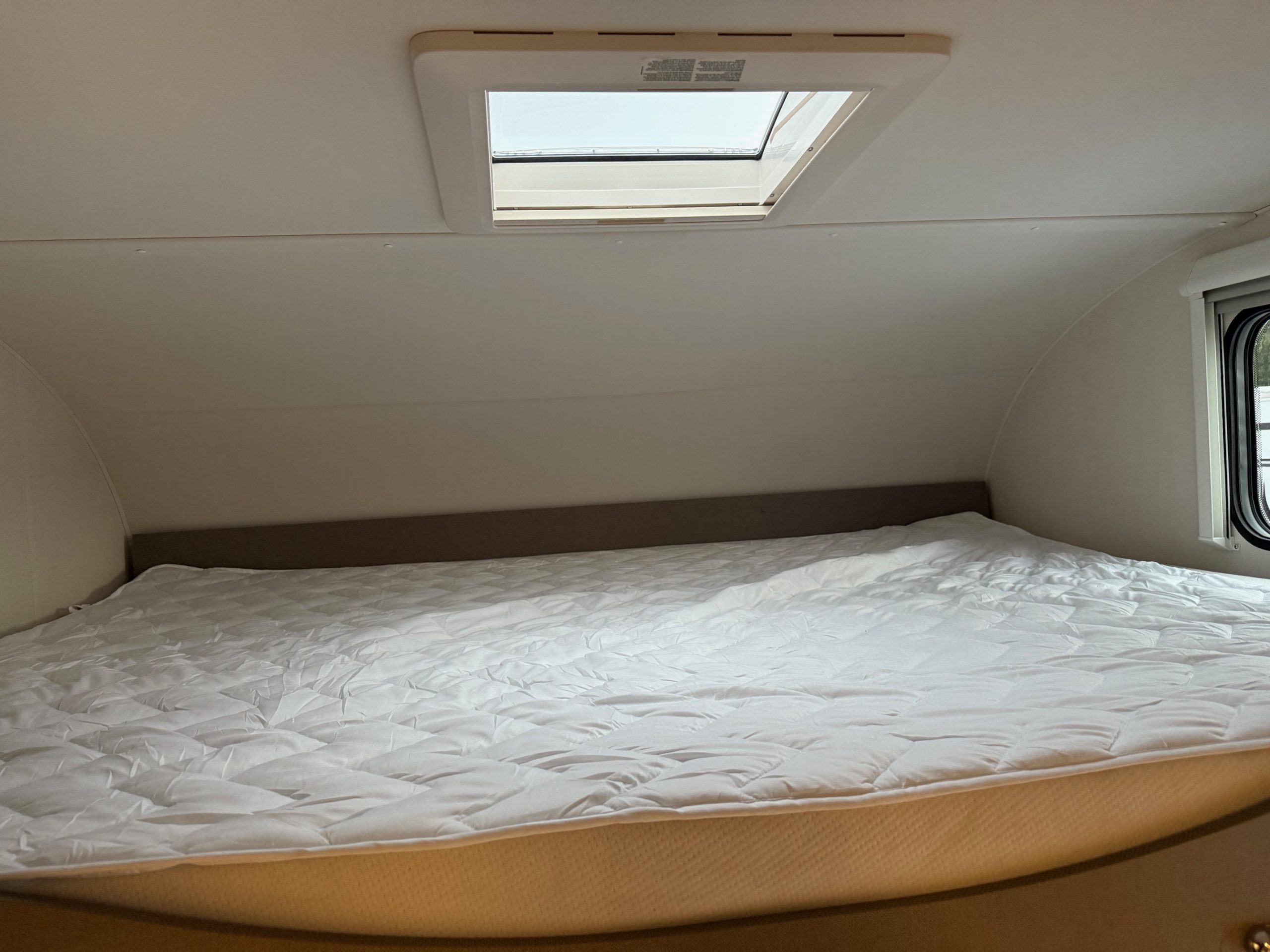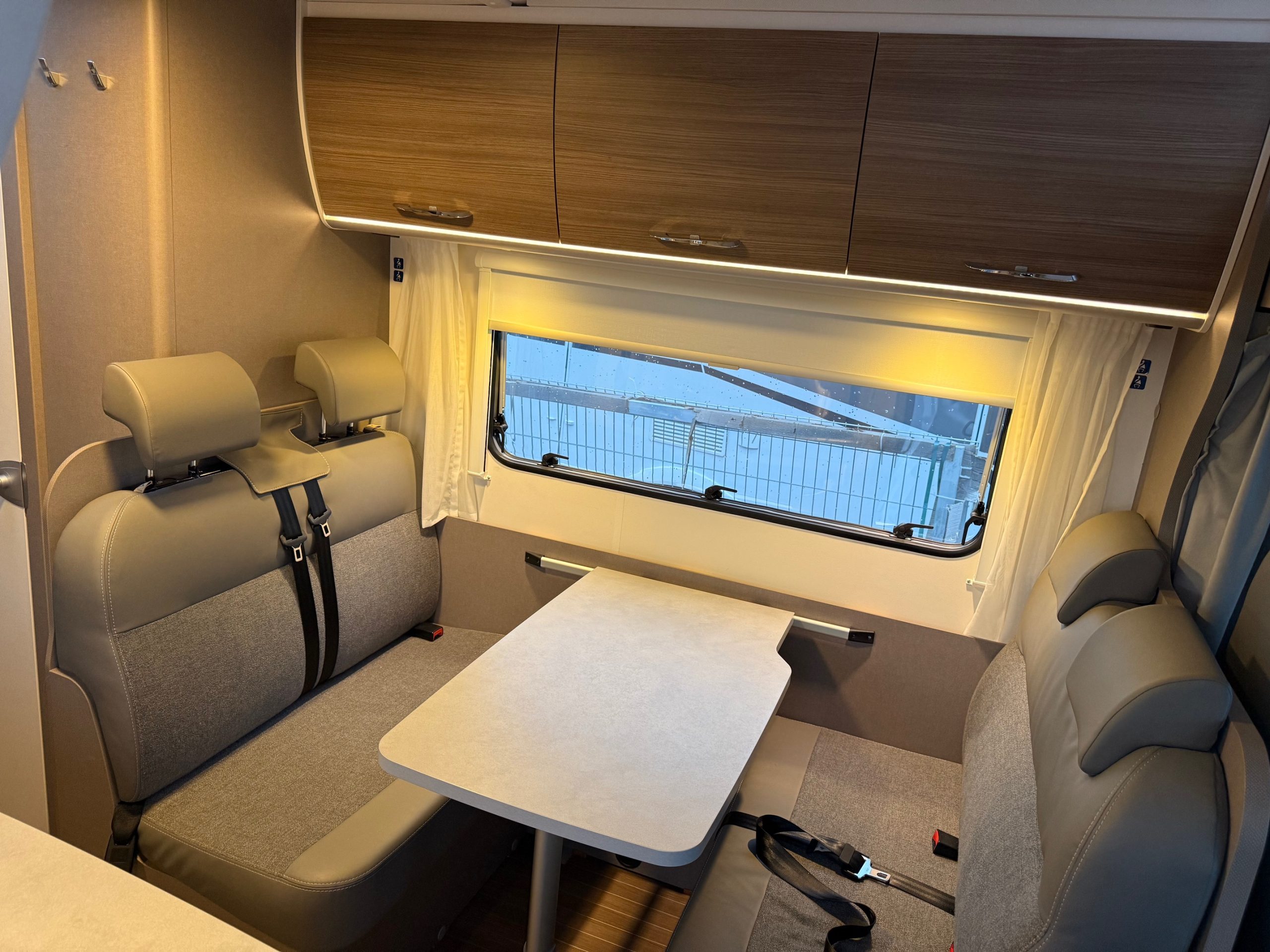 Windows and doors equipped with blackout blinds and insect screens ensure peaceful nights and comfort during the day. The overcab alcove bed measures 165 cm wide and 210 cm long, while the rear double bed offers a generous 140 cm of width. The dinette can also be converted into a smaller bed suitable for shorter travelers.