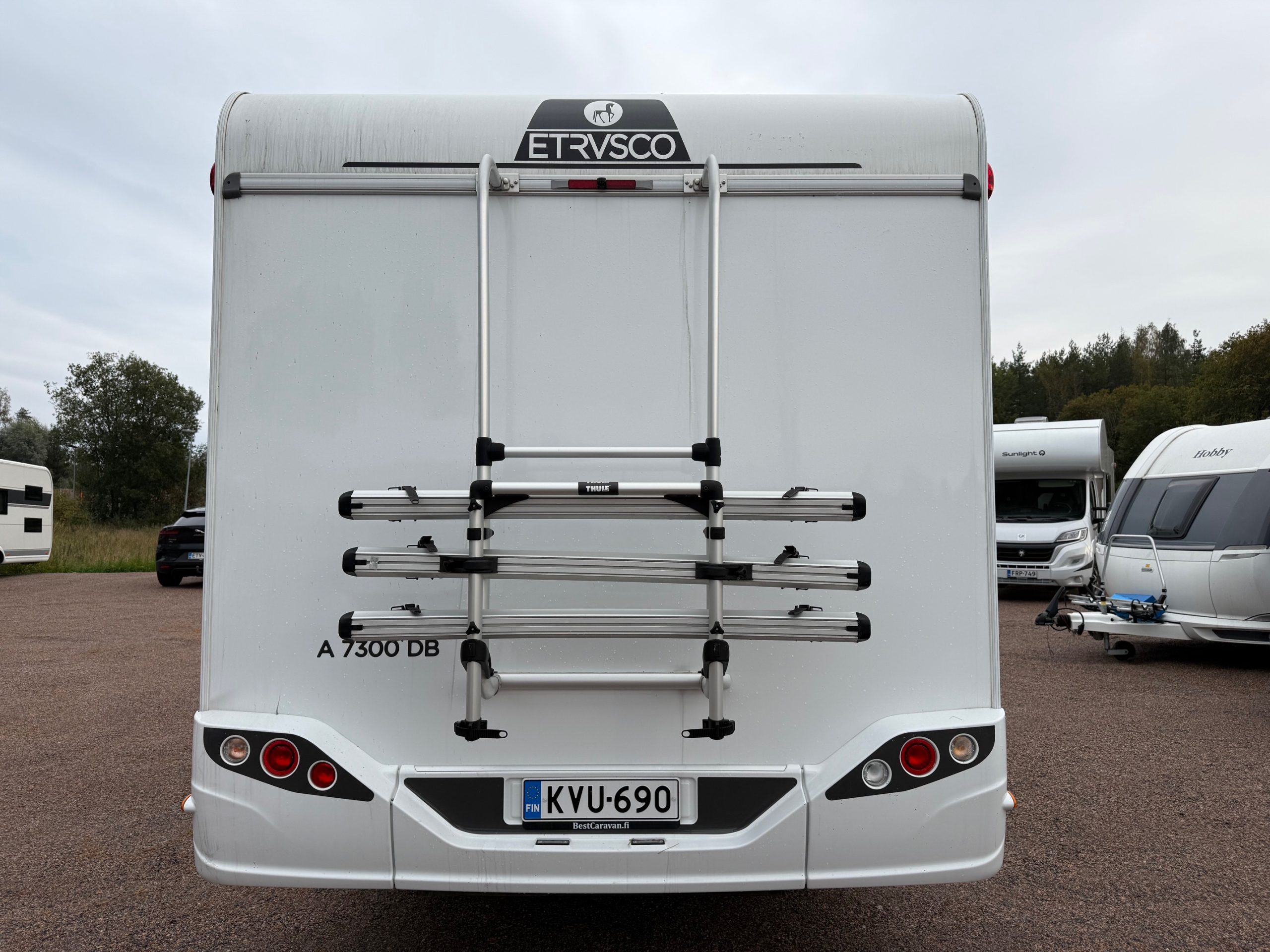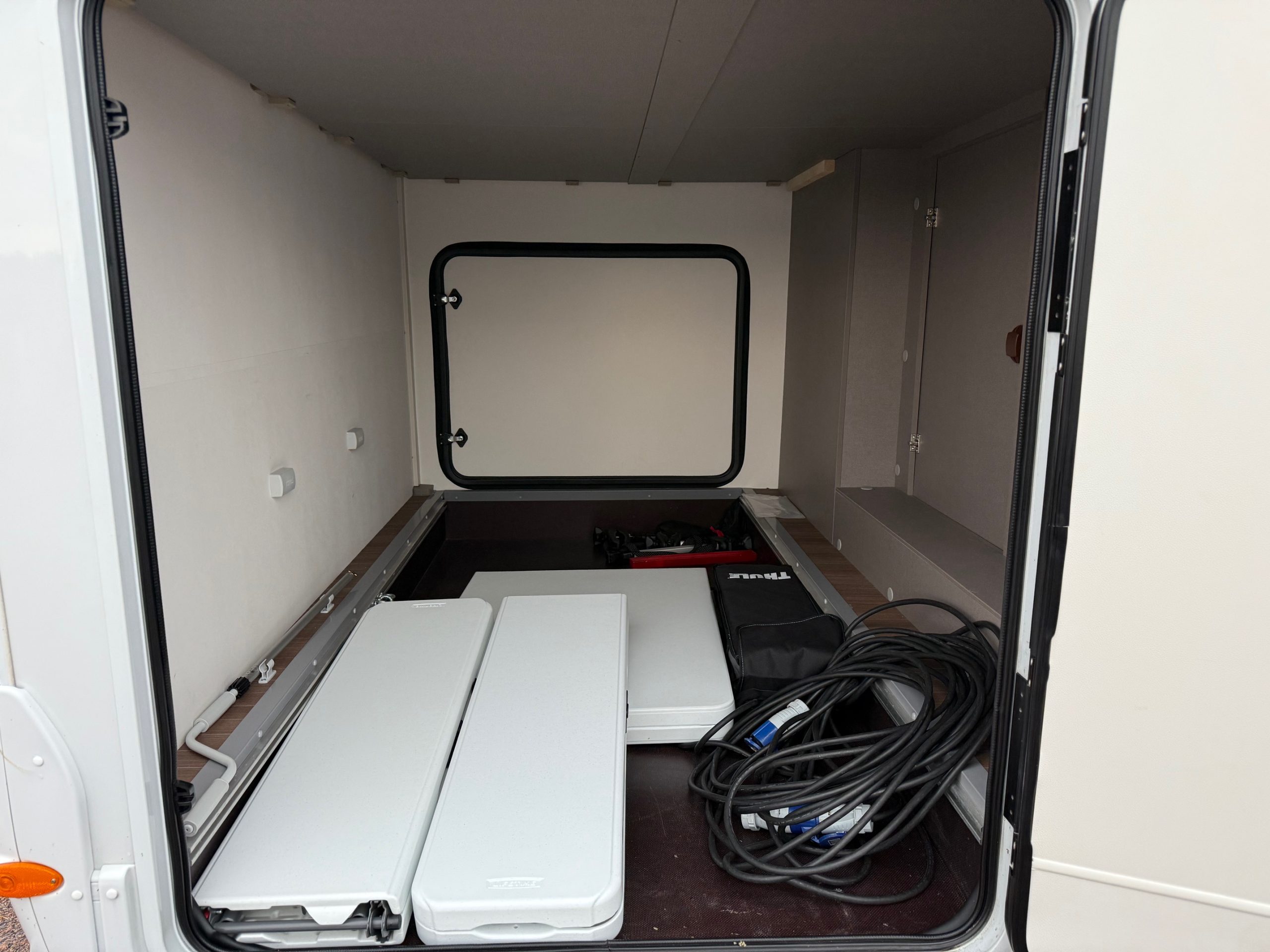 The motorhome is equipped with an awning that provides shelter from both sun and rain, and the included outdoor mat completes the cozy patio area next to the vehicle. A rear-mounted bike rack for three bikes ensures your bicycles can join the adventure – whether you’re heading into the city or out into nature. The huge rear garage easily accommodates sports and outdoor gear.