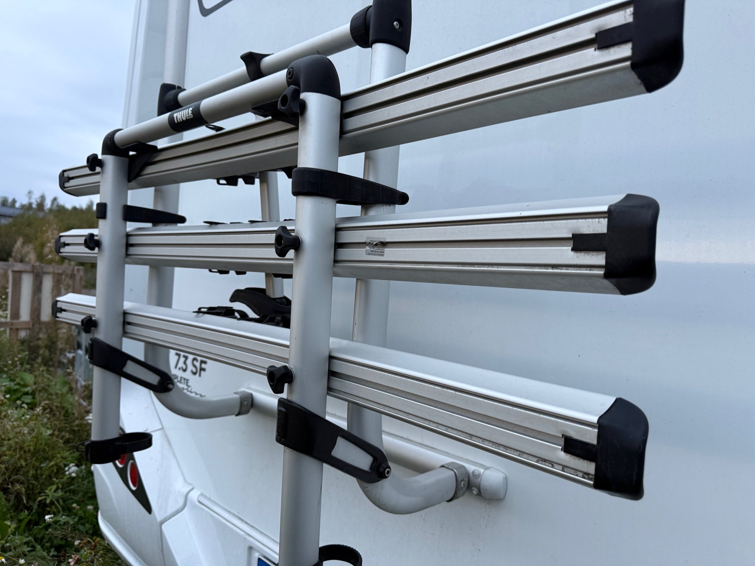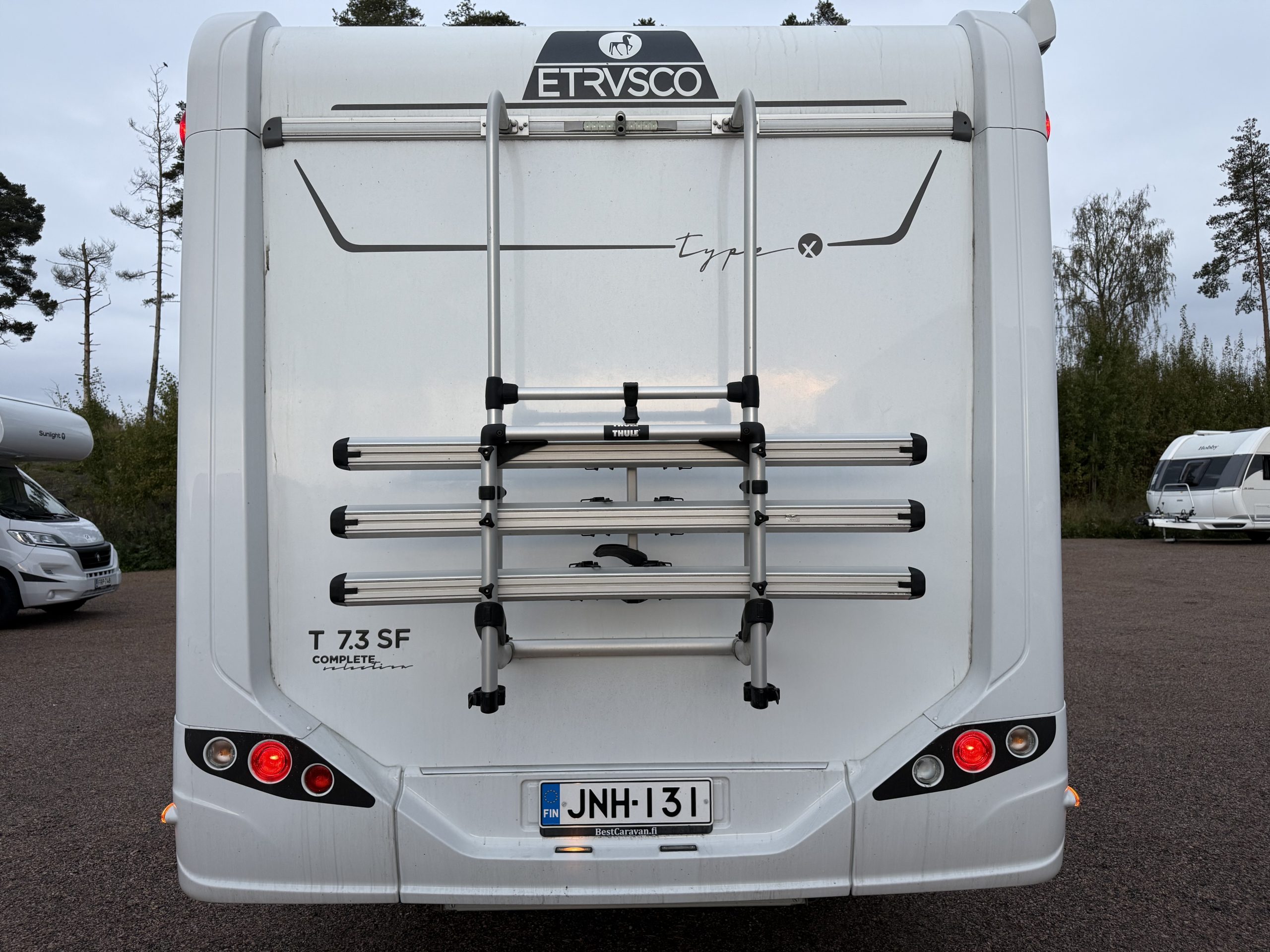 Ford Etrusco T 7.3 SF:ssa on markiisi, joka antaa suojaa auringolta ja sateelta, ja mukana tuleva ulkomatto viimeistelee viihtyisän pihan auton kylkeen. Perässä kulkeva neljän pyörän teline varmistaa, että pyörätkin saadaan reissuun mukaan – olitpa matkalla kaupunkiin tai luonnonhelmaan. Takatalliin mahtuu mukavasti harrastusvälineet.