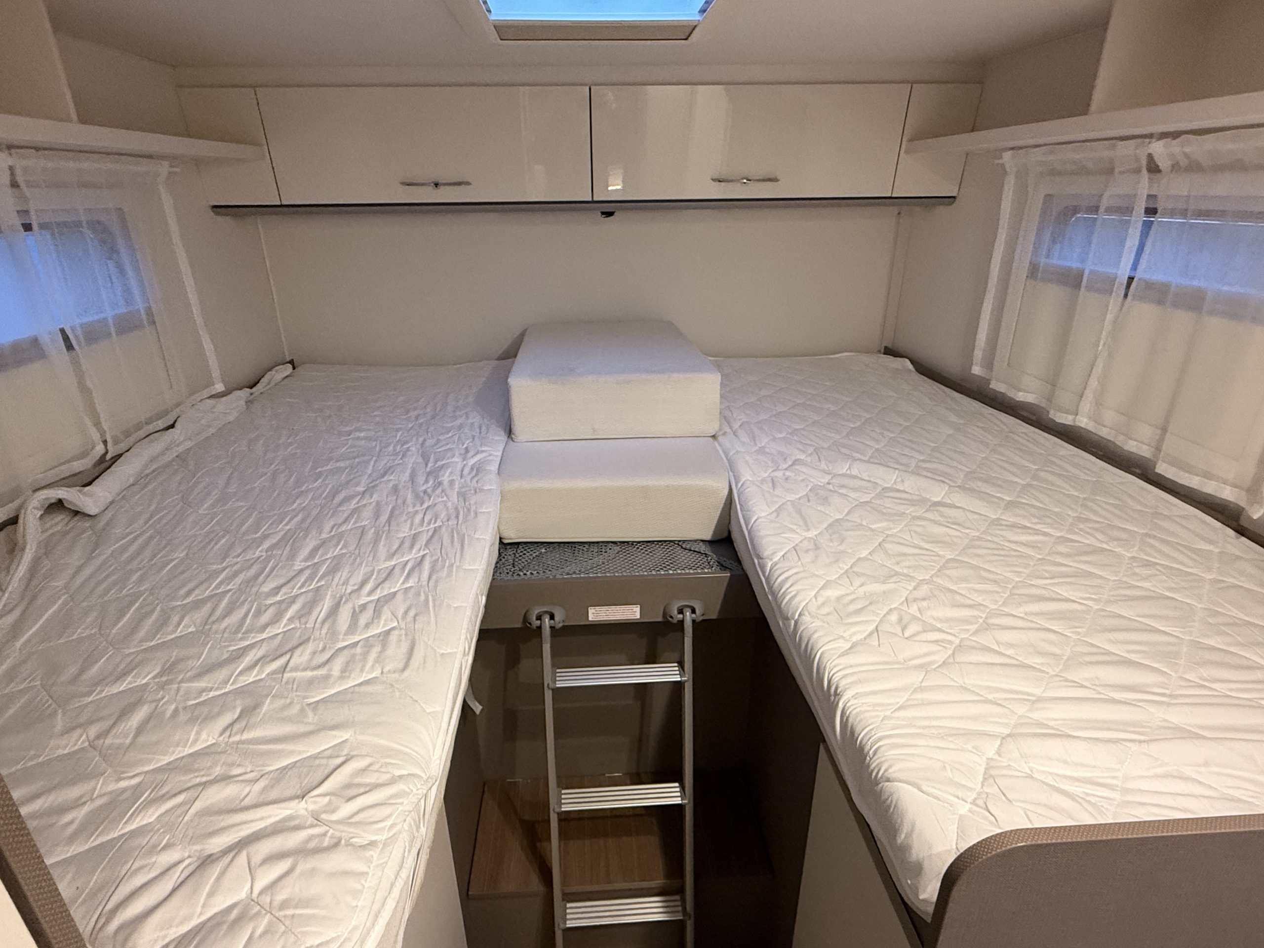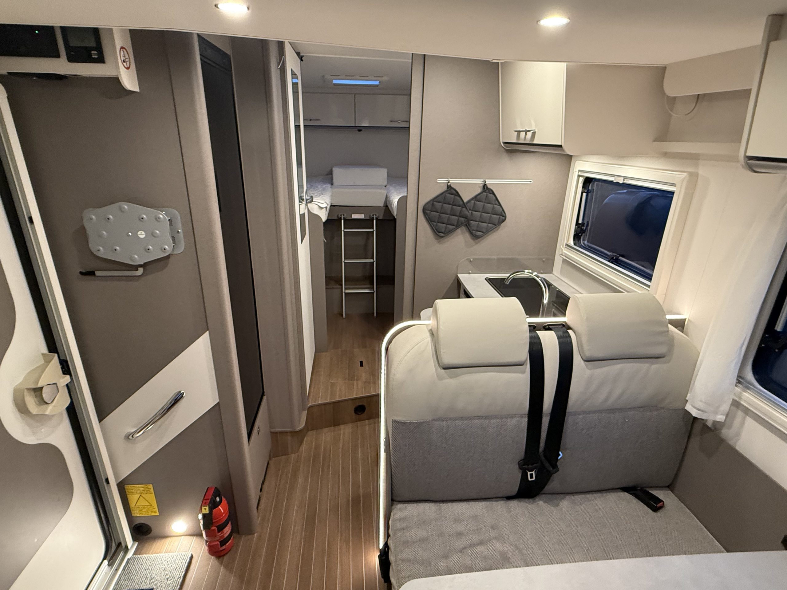 Sisätilat on suunniteltu niin, että kaikille löytyy mukava paikka nauttia matkasta. Tilavassa pöytäryhmässä voi koko seurue istua yhdessä, ja keittiössä on riittävästi tilaa ruokatarpeiden valmistamiseen. Kuljettajan ja matkustajan penkit kääntyvät halutessa asuintilan suuntaan. Isoon jääkaappiin ja erilliseen pakastimeen mahtuvat eväät koko matkan ajaksi. Pimennys- ja hyönteisverkoilla varustetut ikkunat ja ovet takaavat rauhalliset yöunet ja mukavat oltavat päivän aikana. Takaosassa on leveä kolmen hengen sänky ja alaslaskettavassa sängyissä nukkuu kaksi mukavasti. Suihku ja WC on erillisissä tiloissa. Sähköpistokkeita löytyy tarvittavista paikoista. USB-latauspistokkeita on sekä ohjaamossa että asuintilassa.