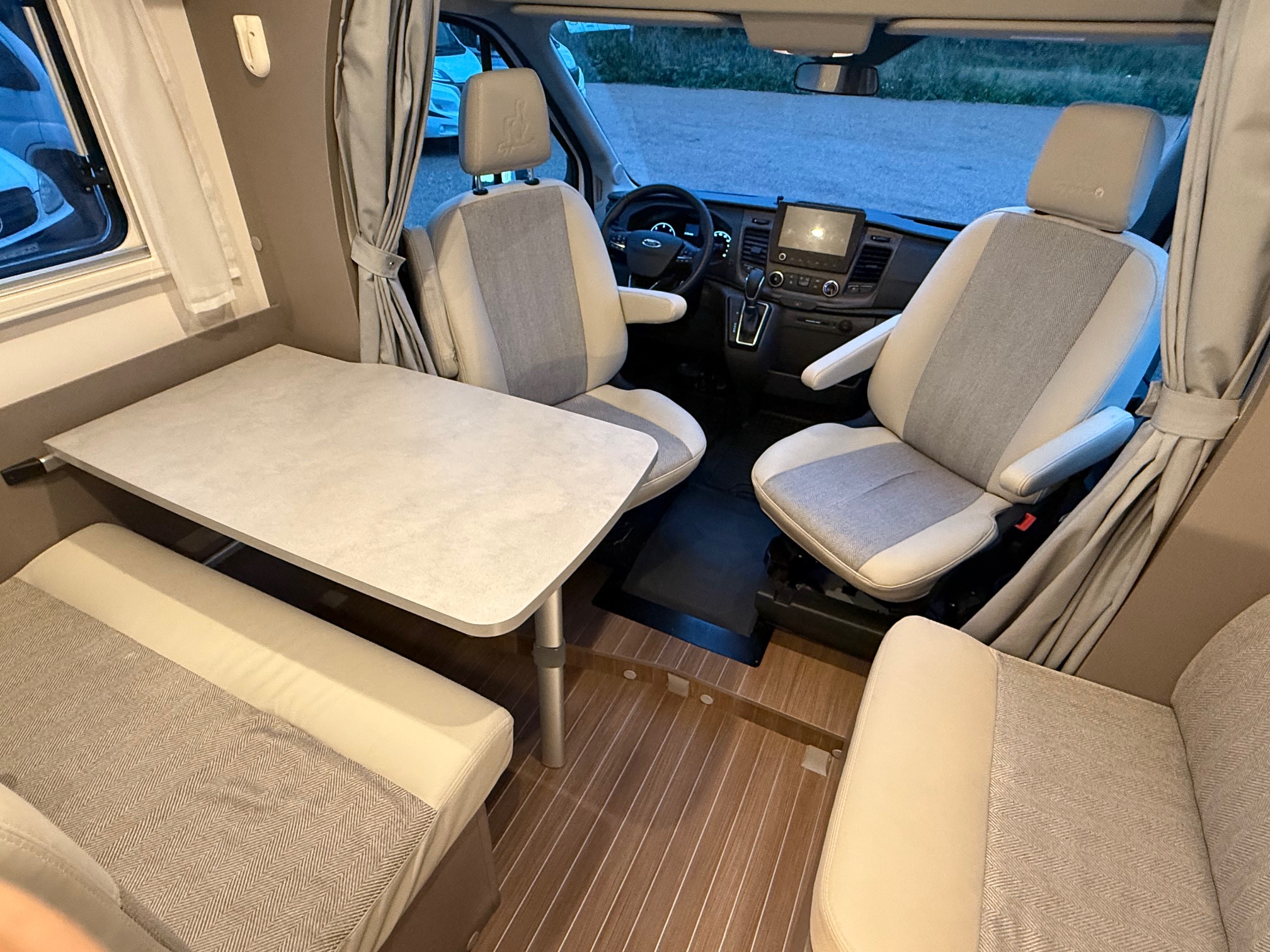Truma 6 -ilmalämmitys pitää auton asuintilat lämpiminä ja veden lämpimänä. Vakiovarusteisiin kuuluu kaksi kaasupulloa ja rikkosuoja, joka mahdollistaa kaasun käytön myös ajon aikana. Näin olet valmis kaikenlaisiin olosuhteisiin. Kuljettajan mukavuutta lisäävät vakionopeudensäädin, automaattivaihteisto, ilmastointi ja peruutuskamera – kaikki tehty Fiatin alustalle, jotta matkanteko sujuisi varmasti ja turvallisesti. Kirsikkana kakun päällä ohjaamon iso näyttö, jossa GooglePlay/Airplay, tekee navigoinnista ja peruuttamisesta vaivatonta.